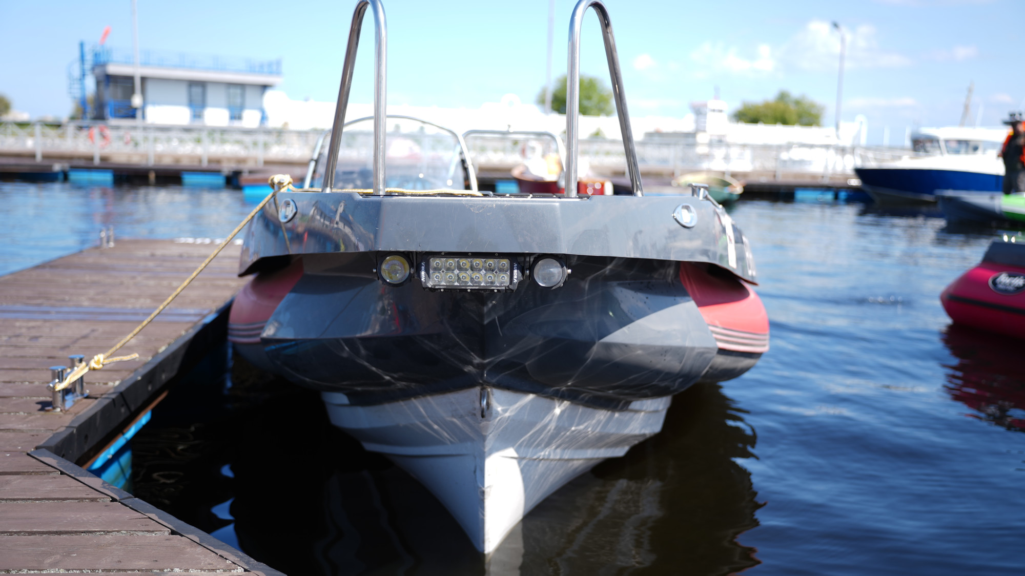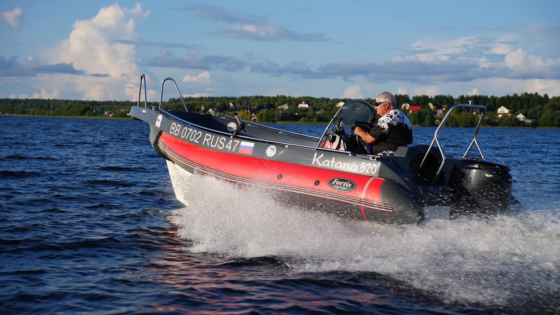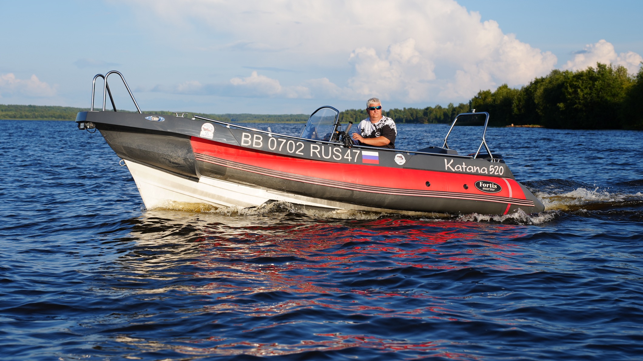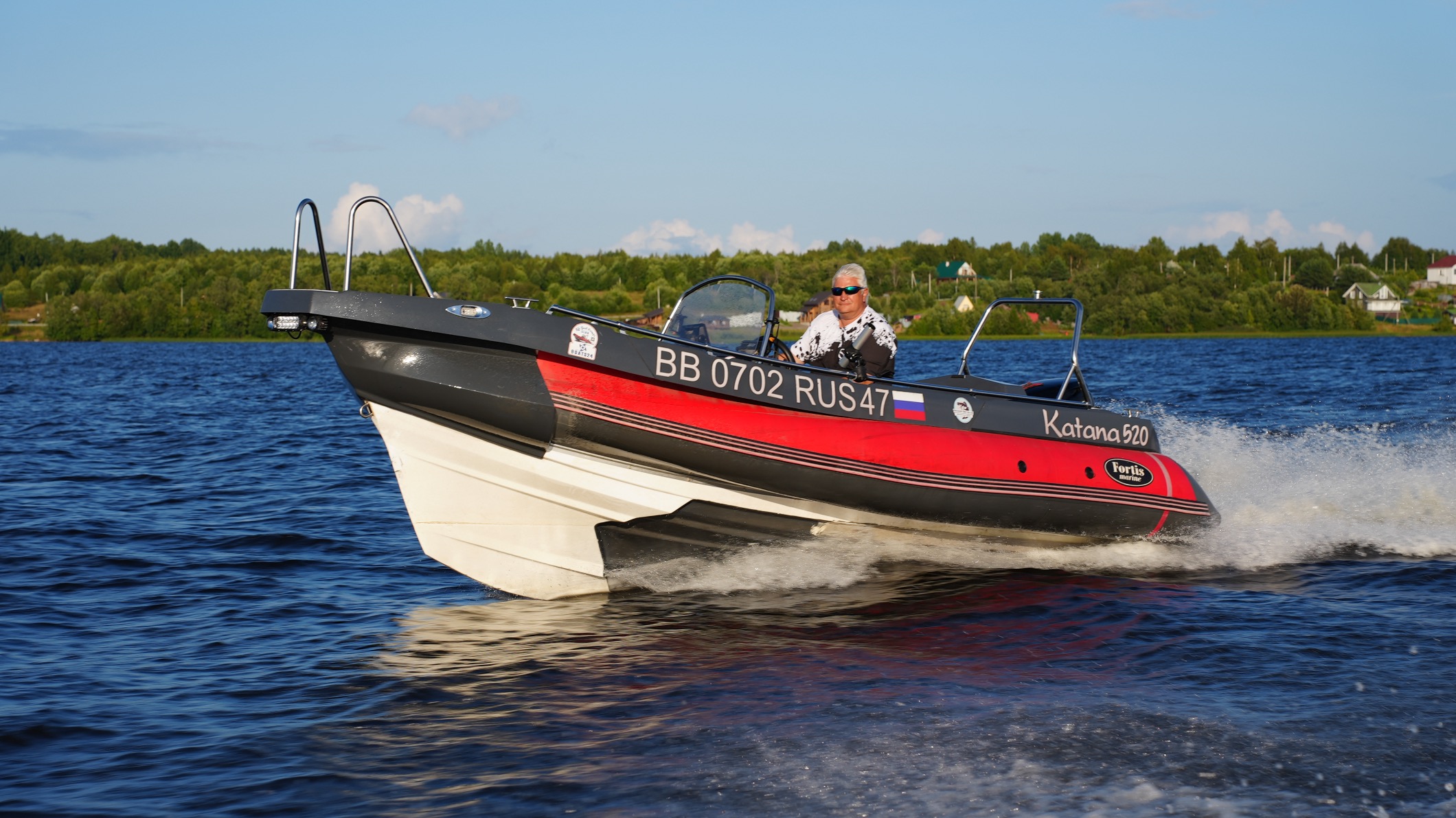 РИБ FORTIS 520 Катана, особенность которой заключается в уникальной конструкции корпуса из стеклопластика с обводами типа «морской нож» с ярко выраженным почти вертикальным форштевнем