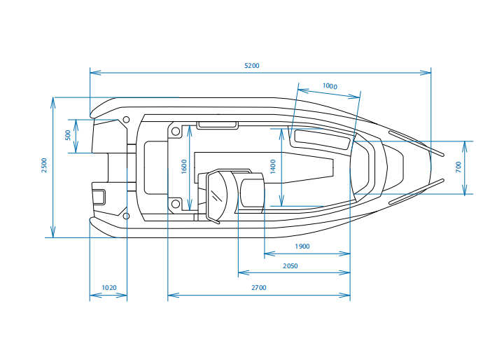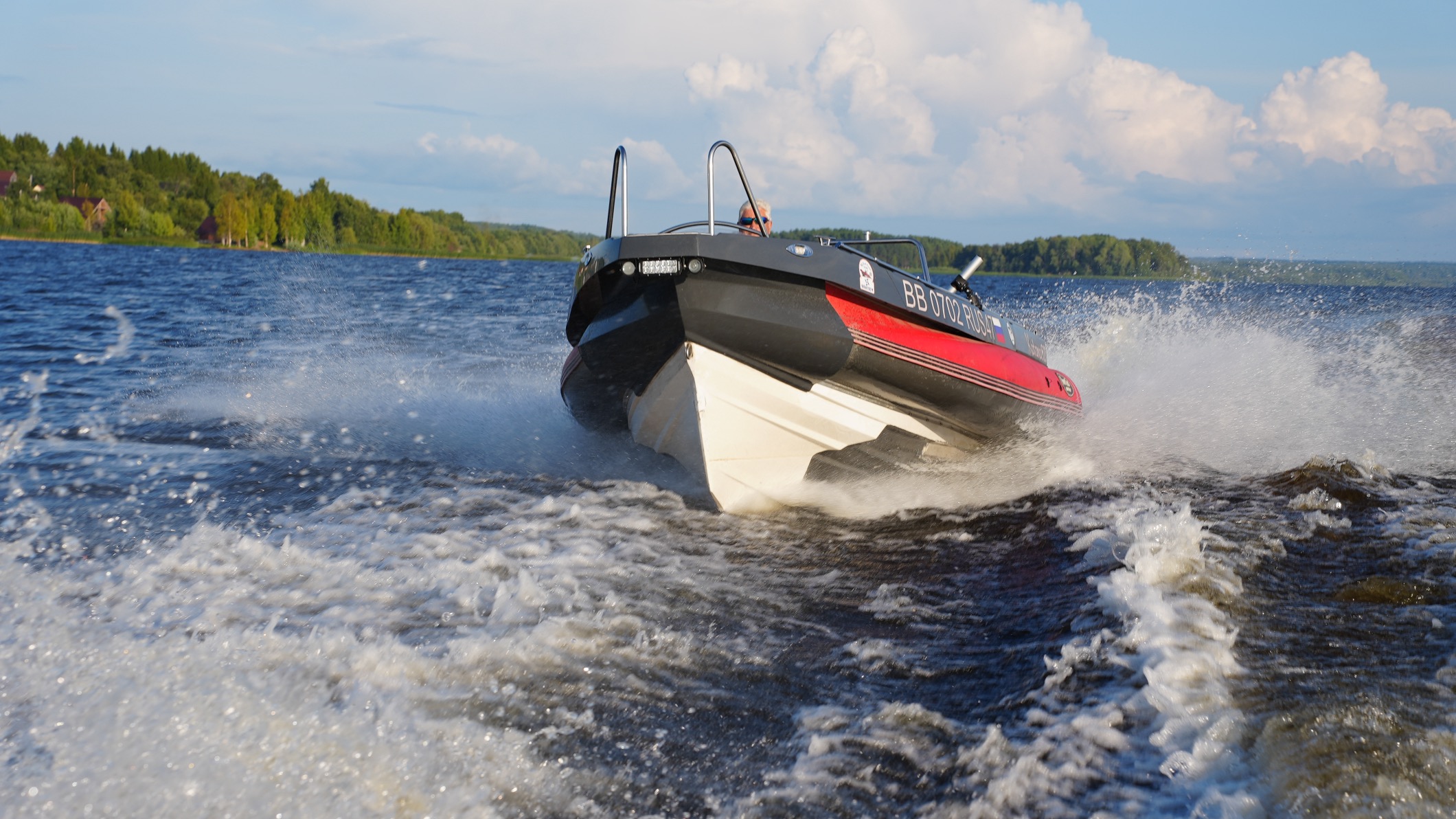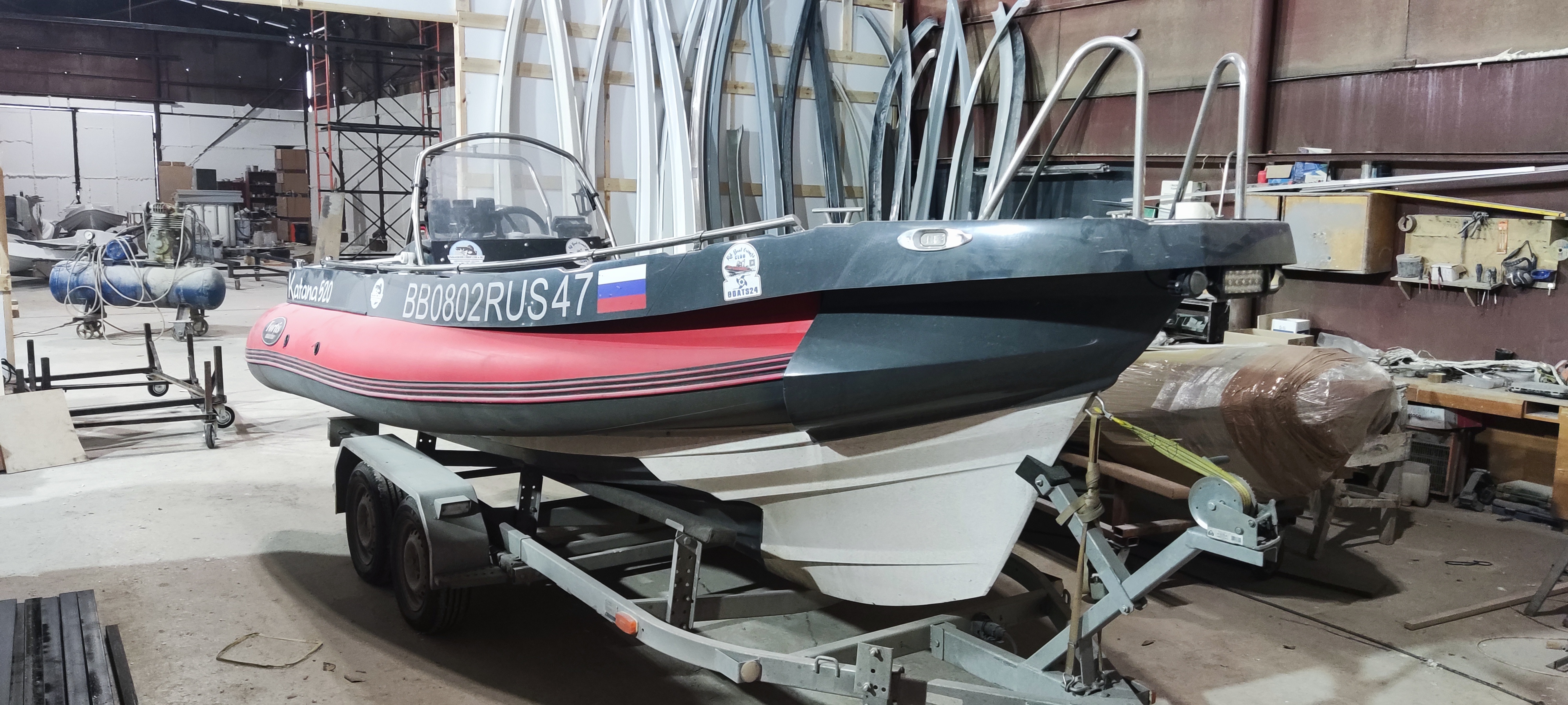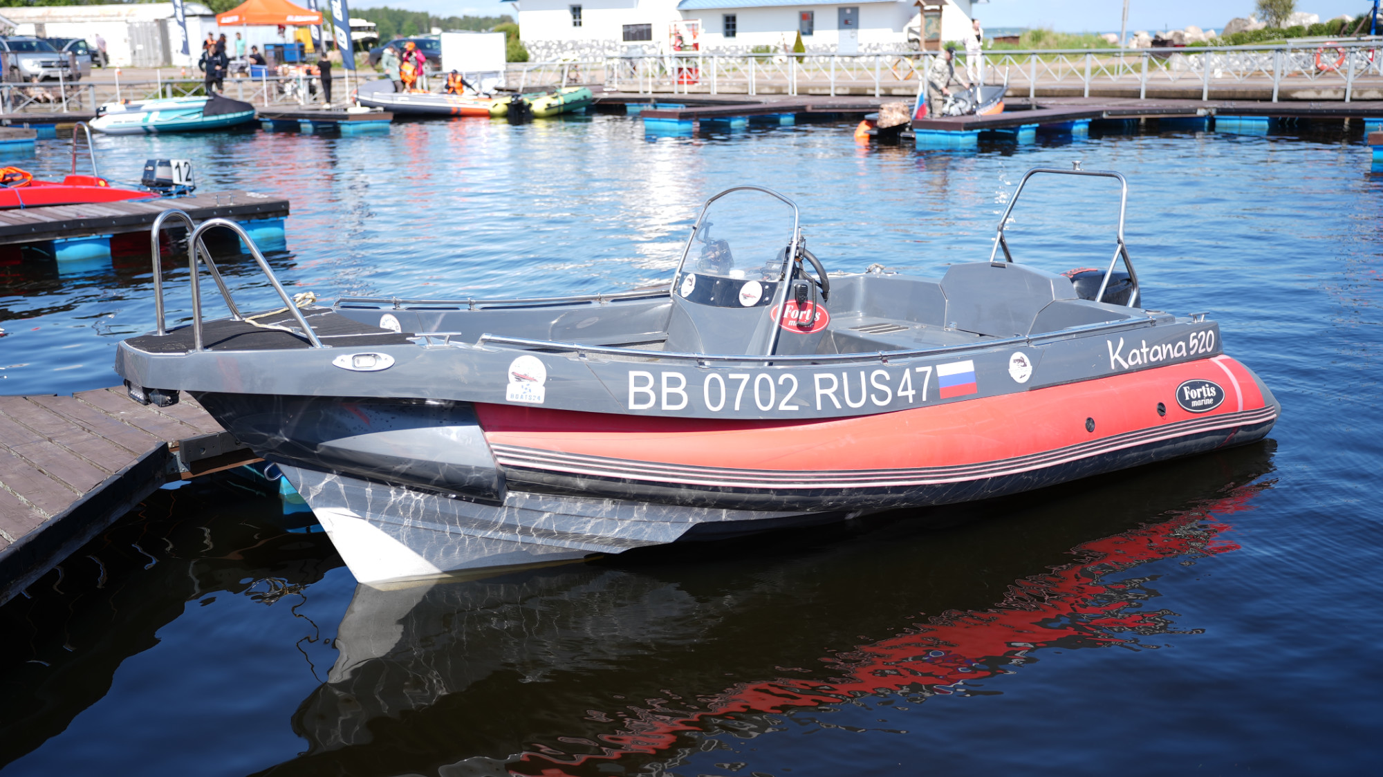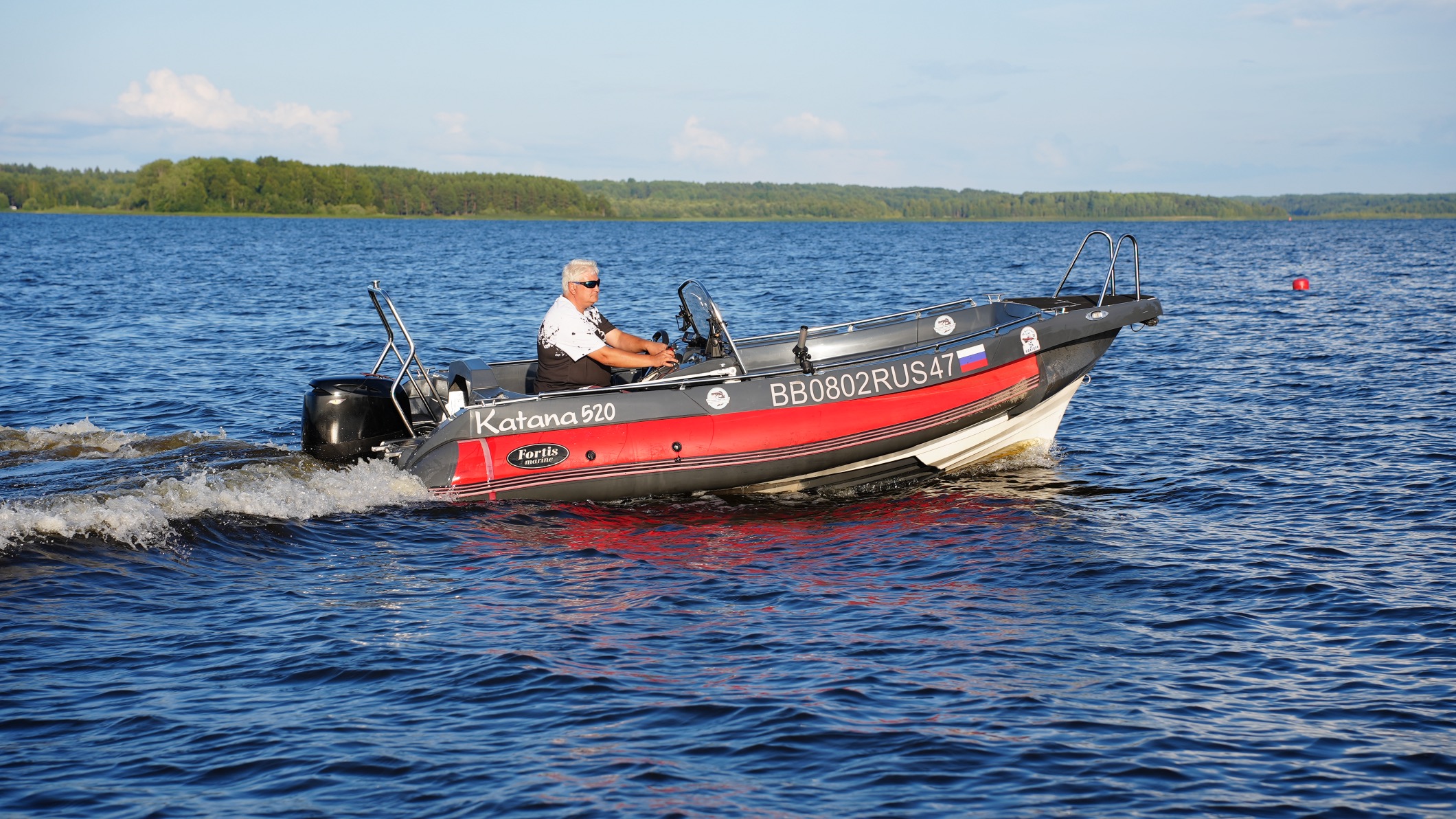 РИБ FORTIS 520 Катана, особенность которой заключается в уникальной конструкции корпуса из стеклопластика с обводами типа «морской нож» с ярко выраженным почти вертикальным форштевнем